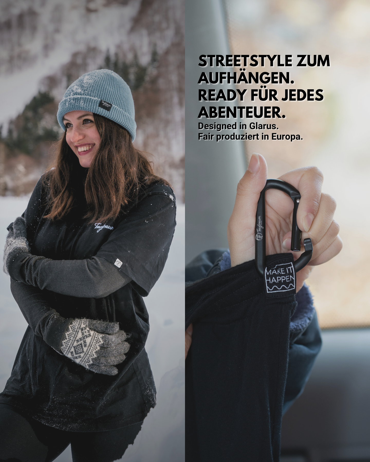 Lasche & Karabiner machen deine Tagtraum Pieces zum treuen Begleiter – Die Produkte lassen sich ganz einfach aufhängen; egal ob auf Reisen, in den Bergen oder beim nächsten City-Trip.