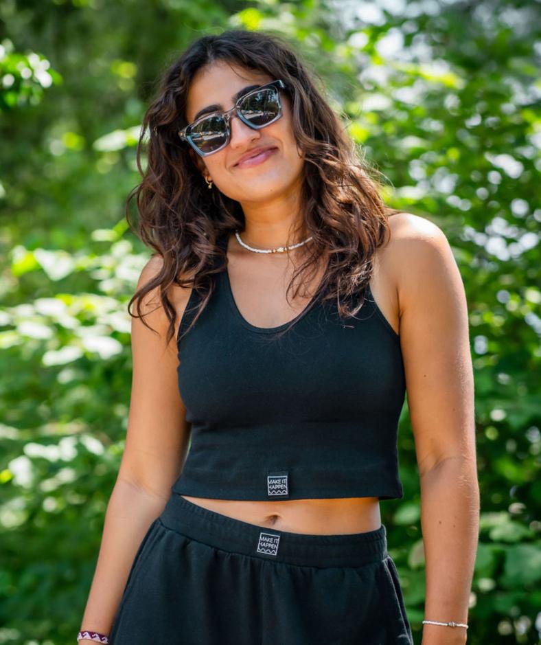 Lalika ist 155cm gross und trägt unser Crop Top in Grösse M sowie die Shorts in Grösse M